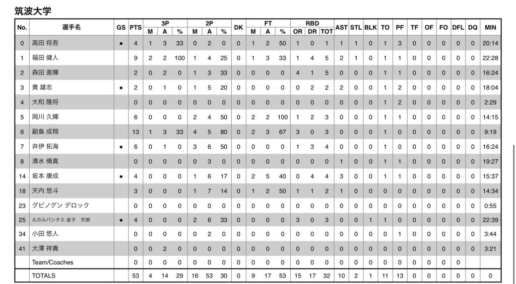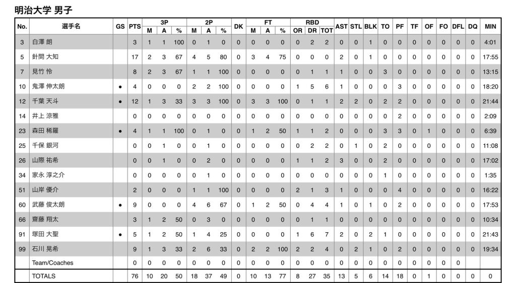 第101回関東大学バスケットボールリーグ戦 第14節 vs. 筑波大学 結果報告 試合結果 2025/10/112025/10/11 10/11(土)12:00TU vs.筑波大学会場:東海大学湘南キャンパス〇明治大76{13-9,20-12,23-14,20-18}53筑波大● 明治大スタート#12千葉,#23森田,#60武藤,#91塚田,#10鬼澤 明治大ベンチメンバー#5針間,#3白澤,#34家永,#51山岸,#26山際,#14井上,#66齋藤,#99石川,#7見竹,#25千保 本学が勝利しました!!応援ありがとうございました!!!