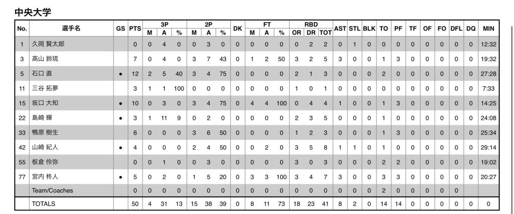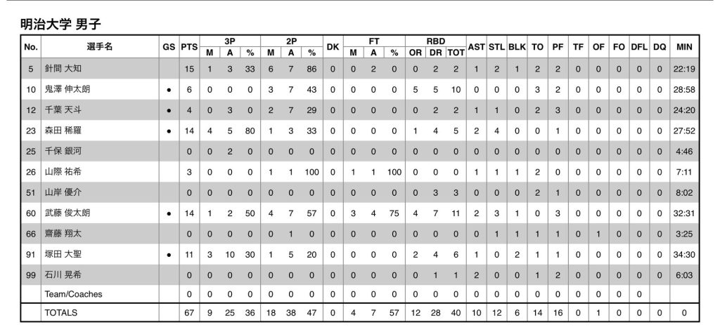 第101回関東大学バスケットボールリーグ戦 第16節 vs. 中央大学 結果報告 試合結果 2025/10/132025/10/13 10/13(月)11:00TU vs.中央大学会場:筑波大学〇明治大67{17-8,15-22,17-10,18-10}50中央大● 明治大スタート#12千葉,#23森田,#60武藤,#91塚田,#10鬼澤 明治大ベンチメンバー#5針間,#3白澤,#34家永,#51山岸,#26山際,#14井上,#66齋藤,#99石川,#7見竹,#25千保 本学が勝利しました!!応援ありがとうございました!!!