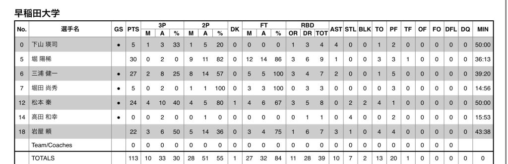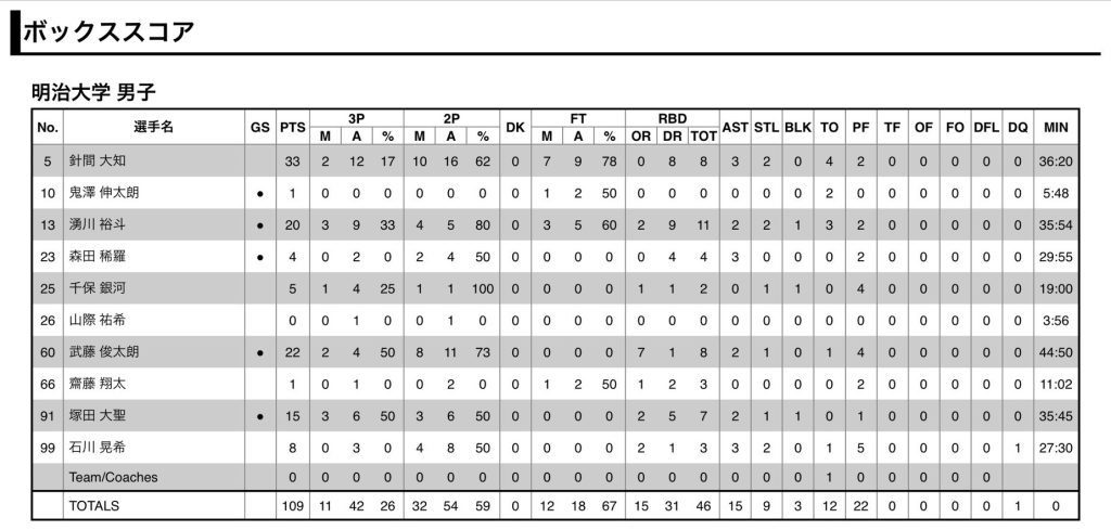 ●明治大109{18-22,16-26,30-20,23-19,11-11,11-15}113早稲田大〇
