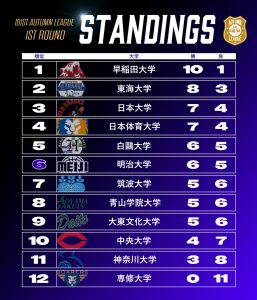 ▼1巡目結果▼明治大学は〈 6勝5敗 第6位 〉という結果でリーグ戦1巡目を終えました。 たくさんのご声援をありがとうございました!2巡目も明治大学の応援をよろしくお願いします!!